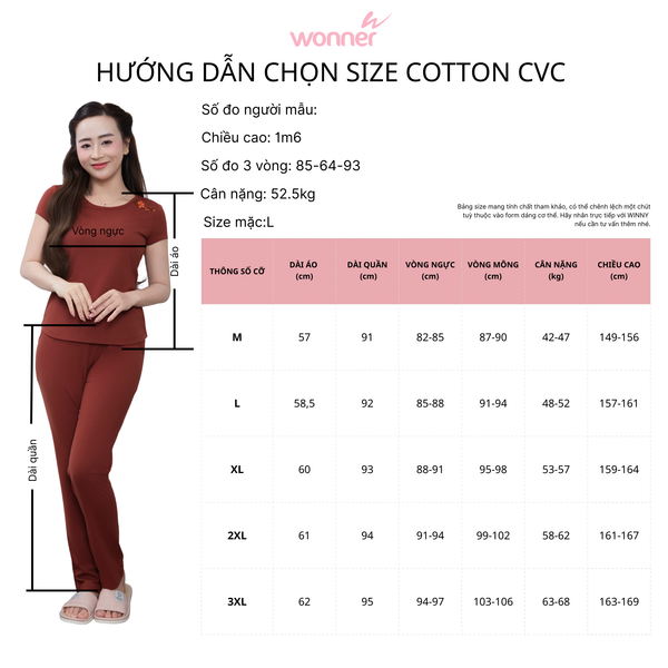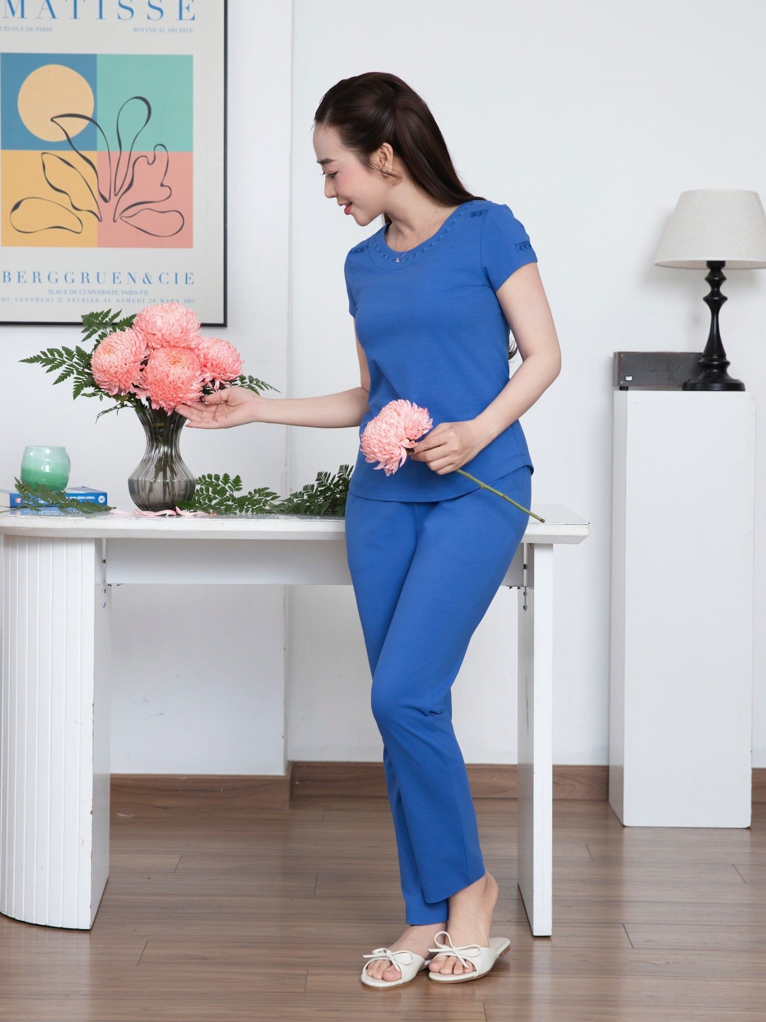 Áo -Kiểu dáng: Áo ngắn tay, dáng ôm sát cơ thể, tôn dáng tạo đường nét mềm mại. -Màu sắc: Xanh da trời tạo sự hài hòa và mát mắt. -Chi tiết trang trí: Phần cổ áo có thiết kế đơn giản, không cầu kỳ, giúp tổng thể thanh lịch, chi tiết ren vai và ren tay áo tạo sự mềm mại. -Họa tiết: In hoa đáp cổ áo tạo điểm nhấn. Quần -Kiểu dáng: Quần dài ống ôm, đồng bộ với màu áo. -Thiết kế: Đơn giản, không có nhiều chi tiết cầu kỳ, tập trung vào sự thoải mái. CHẤT LIỆU: -53% Cotton, 37% Polyester, 10% spandex -Trọng lượng: 195 GSM - 200 GSM -Bề mặt: Mặt vải mịn, mềm, thoáng và có độ rủ nhẹ. -Cảm giác khi chạm: khi sờ có cảm giác êm. -Độ dày: vừa phải. ƯU ĐIỂM: -Thoáng khí, hút ẩm tốt nhờ thành phần cotton cao. -Co giãn nhẹ, ít nhăn, giữ form tốt nhờ polyester và spandex. -Bề mặt mềm mịn, không gây bí nóng, dễ chịu khi tiếp xúc trực tiếp với da. -Độ bền cao, giặt nhiều lần không bị bai nhão hoặc xù lông. -Giá thành hợp lý, dễ chăm sóc, phù hợp mặc hằng ngày. FORM DÁNG: -Form dáng vừa người, tôn dáng. LƯU Ý KHI TƯ VẤN: -Thích hợp sử dụng: mặc ở nhà, ngủ. -Phù hợp khí hậu: thích hợp với các mùa trong năm -Gợi ý size: chọn đúng size cơ thể; nếu thích rộng rãi, nên chọn tăng 1 size. -Phong cách: basic phù hợp với khách hàng thích mặc ôm gọn người, thích hợp với độ tuổi trung niên. HƯỚNG DẪN SỬ DỤNG: -Giặt: Nên giặt bằng nước lạnh hoặc nước ấm nhẹ (dưới 40°C) để giữ màu và độ co giãn. -Phơi: Lộn trái khi giặt và phơi để tránh bạc màu ở mặt ngoài. -Ủi: Không dùng thuốc tẩy hoặc bàn ủi quá nóng.