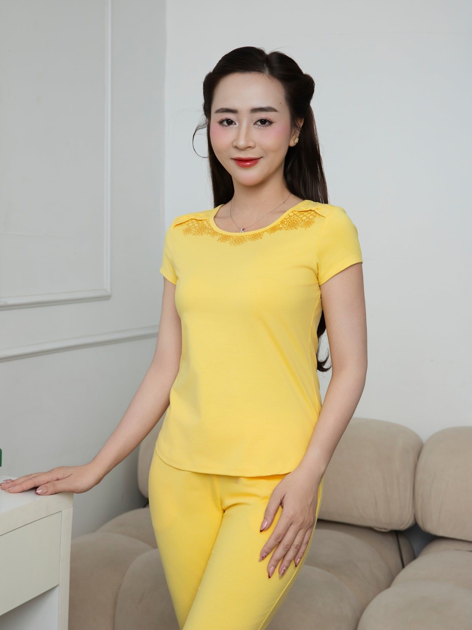 Áo -Kiểu dáng: Áo ngắn tay, dáng ôm sát cơ thể, tôn dáng tạo đường nét mềm mại. -Màu sắc: Vàng tạo sự rực rỡ và thu hút ánh nhìn. -Chi tiết trang trí: Phần vai cách điệu thành nơ giúp áo không bị đơn điệu và tạo nét tinh tế. -Họa tiết: in hoa tràn ở hai bên vai xuống phần cổ áo thân trước. Quần -Kiểu dáng: Quần lửng, ôm vừa phải, giúp dáng người gọn gàng và trẻ trung. -Thiết kế: Đơn giản, không có nhiều chi tiết cầu kỳ, tập trung vào sự thoải mái. CHẤT LIỆU: -53% Cotton, 37% Polyester, 10% spandex -Trọng lượng: 195 GSM - 200 GSM -Bề mặt: Mặt vải mịn, mềm, thoáng và có độ rủ nhẹ. -Cảm giác khi chạm: khi sờ có cảm giác êm. -Độ dày: vừa phải. ƯU ĐIỂM: -Thoáng khí, hút ẩm tốt nhờ thành phần cotton cao. -Co giãn nhẹ, ít nhăn, giữ form tốt nhờ polyester và spandex. -Bề mặt mềm mịn, không gây bí nóng, dễ chịu khi tiếp xúc trực tiếp với da. -Độ bền cao, giặt nhiều lần không bị bai nhão hoặc xù lông. -Giá thành hợp lý, dễ chăm sóc, phù hợp mặc hằng ngày. FORM DÁNG: -Form dáng vừa người, tôn dáng. LƯU Ý KHI TƯ VẤN: -Thích hợp sử dụng: mặc ở nhà, ngủ. -Phù hợp khí hậu: thích hợp với các mùa trong năm -Gợi ý size: chọn đúng size cơ thể; nếu thích rộng rãi, nên chọn tăng 1 size. -Phong cách: basic phù hợp với khách hàng thích mặc ôm gọn người, thích hợp với độ tuổi trung niên. HƯỚNG DẪN SỬ DỤNG: -Giặt: Nên giặt bằng nước lạnh hoặc nước ấm nhẹ (dưới 40°C) để giữ màu và độ co giãn. -Phơi: Lộn trái khi giặt và phơi để tránh bạc màu ở mặt ngoài. -Ủi: Không dùng thuốc tẩy hoặc bàn ủi quá nóng.