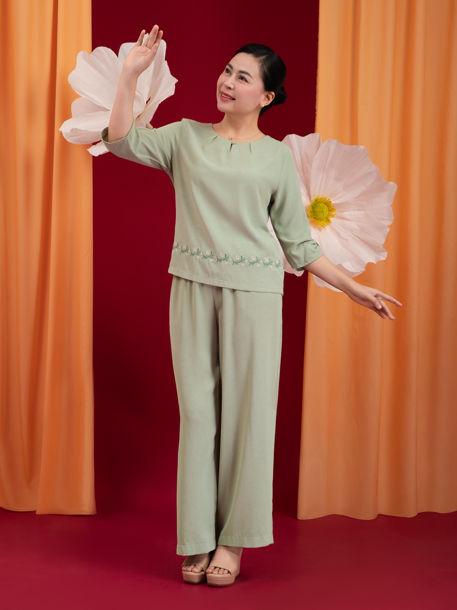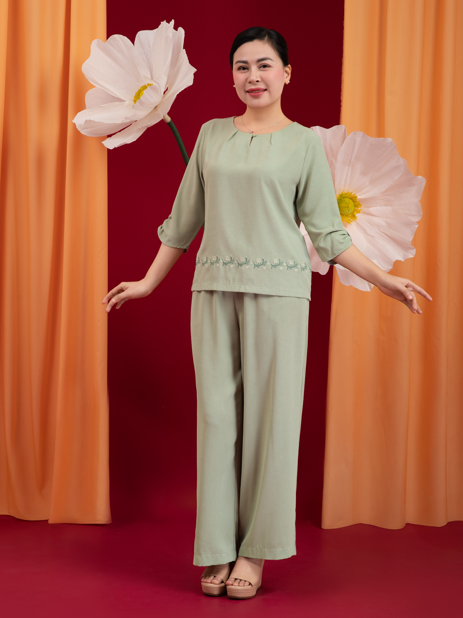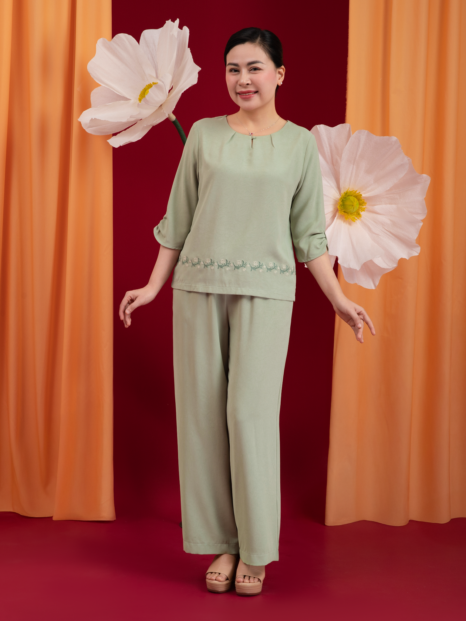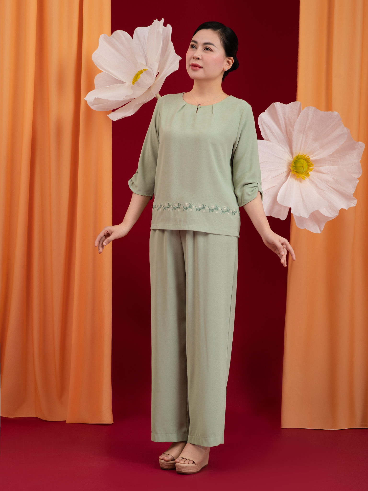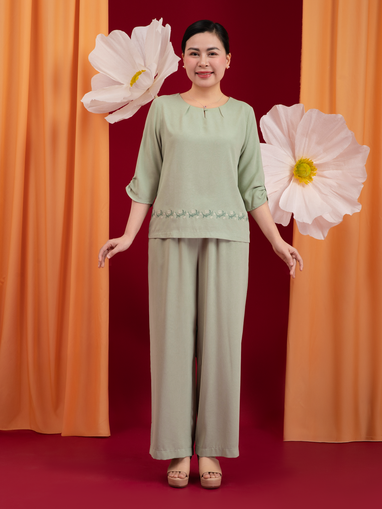 - Form dáng: Áo vừa vặn tạo đường thắt eo, quần ống xuông thẳng thoải mái, dễ mặc, tôn dáng nhẹ nhàng.