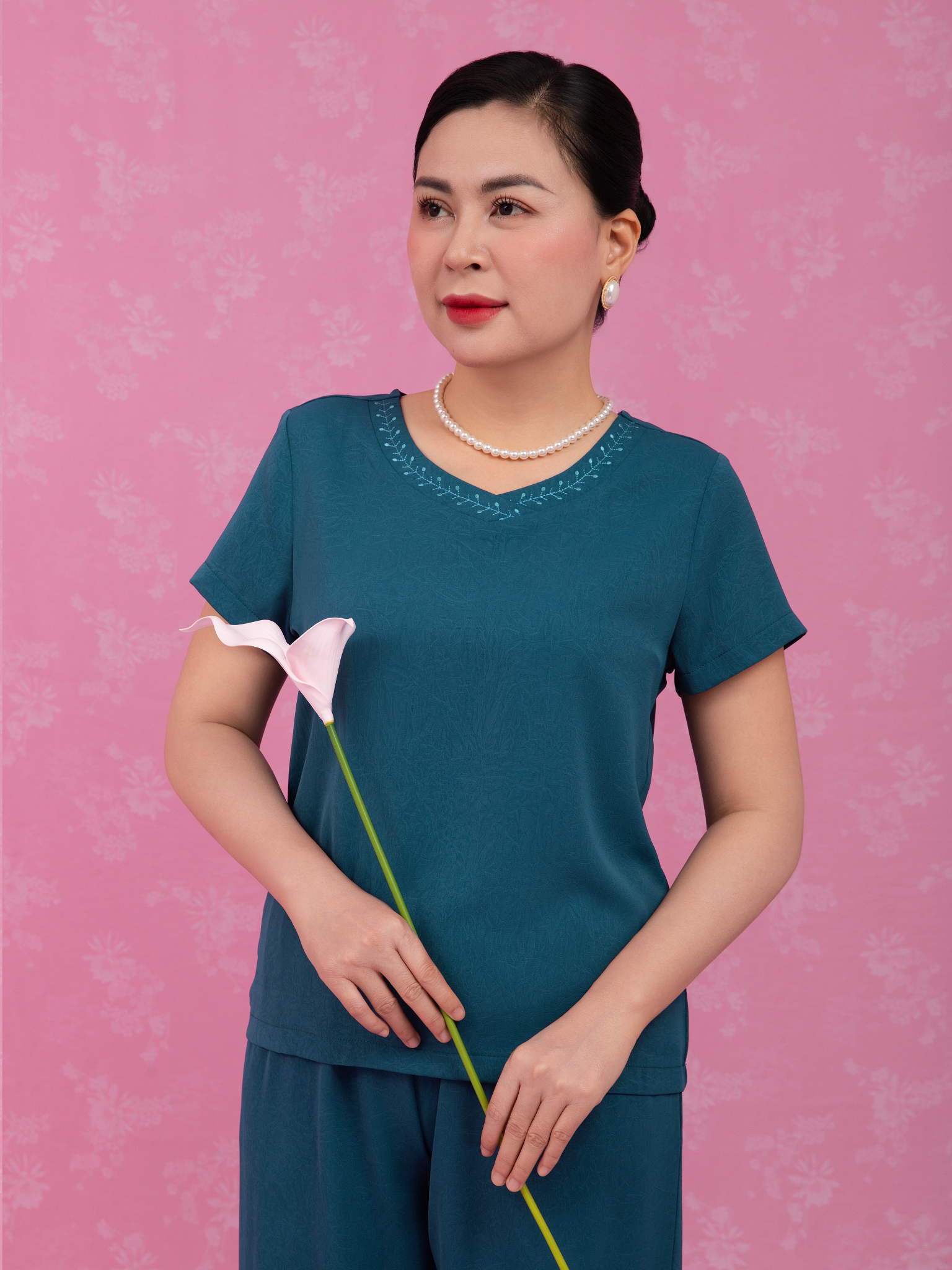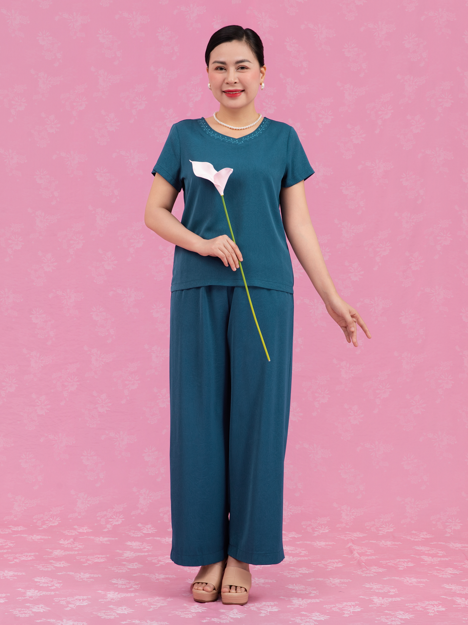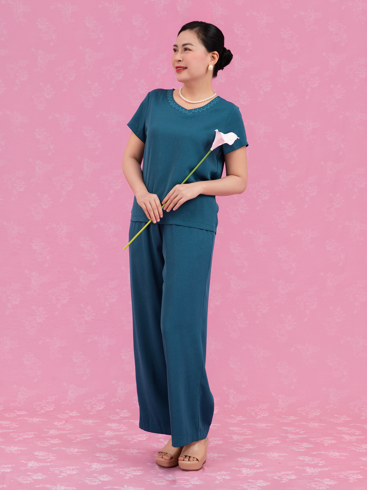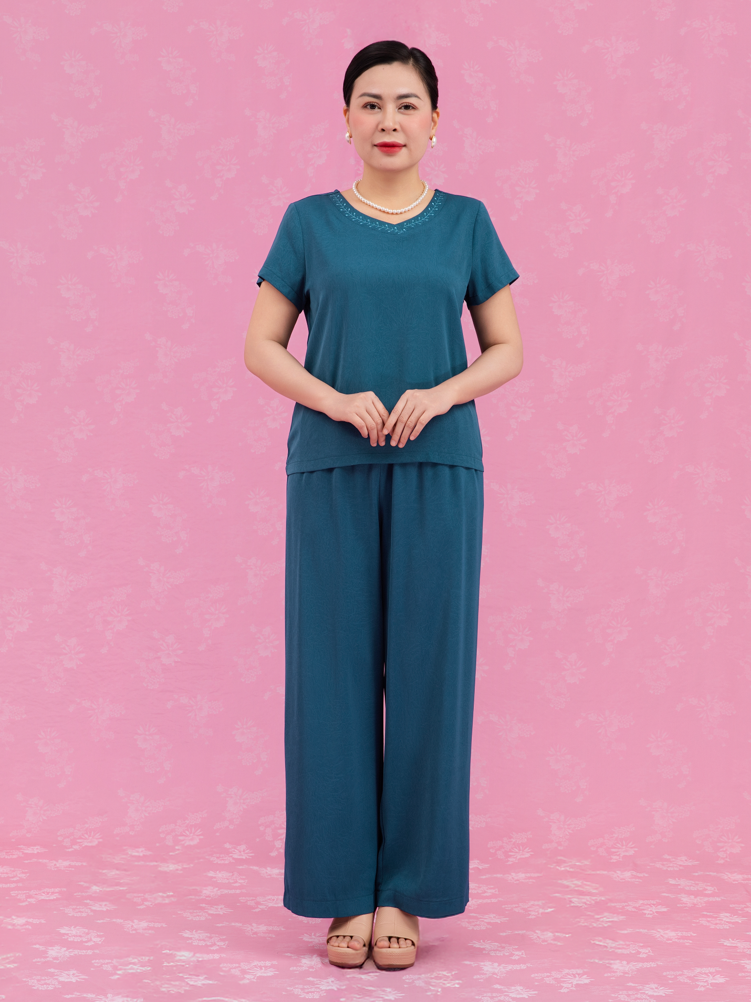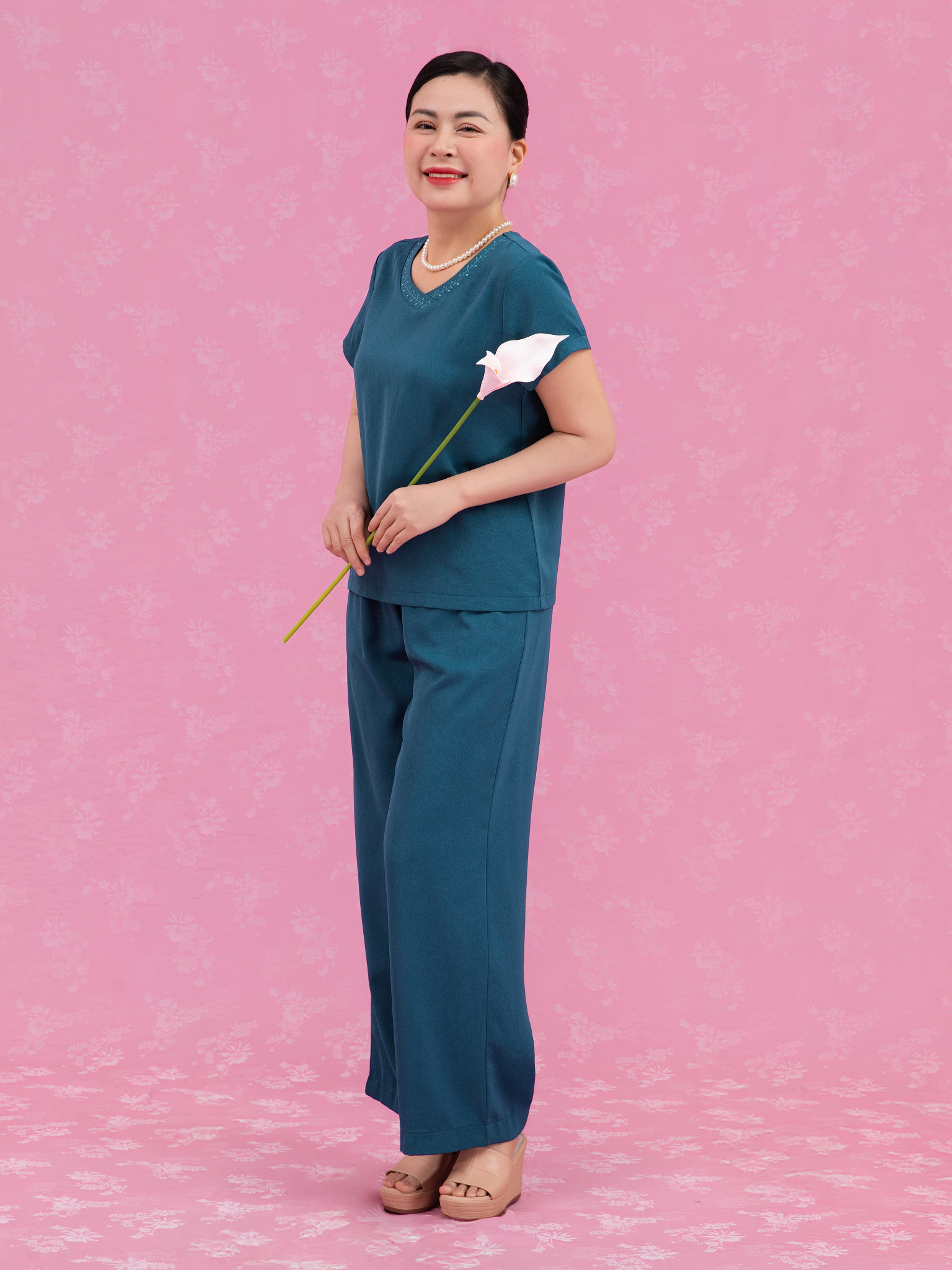 - Form dáng: Áo vừa vặn tạo đường thắt eo, quần ống suông thẳng thoải mái, dễ mặc, tôn dáng nhẹ nhàng.